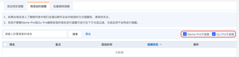 过期域名提醒-我添加的提醒页面,支持勾选“ Name-Pre不提醒”或“ Gu-Pre不提醒”,您可根据对域名的需求灵活设置,让提醒更精准高效。