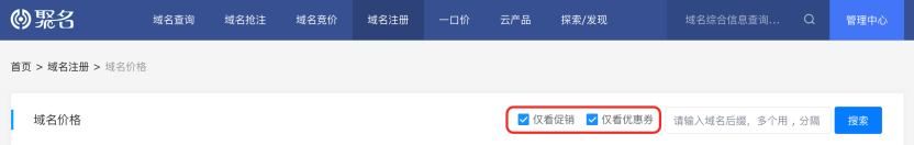 域名注册价格页新增【仅看优惠券】选项,可与【仅看促销】同时勾选,系统将根据勾选状态实时展示符合条件的后缀,让您更直观查看所需域名后缀。
