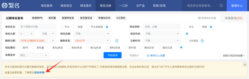 在域名查询、抢注、竞价及一口价页面的域名构成纯数字筛选项中,特别构成筛选条件支持多种字符,更加方便您根据需求进行搜素。