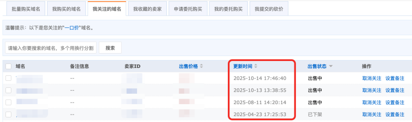 我是买家-我关注的域名页面,列表现默认按照更新时间降序排列,最新关注域名靠前展示,查看更便捷。